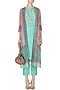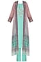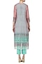 Featuring a blue kurta in cotton base highlighted using gota patti hand embroidered motif on the bodice. It is paired with matching straight pants and pink to blue ombre front open jacket with jaipuri print all over.