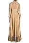 This set features a gold flared kalidaar anarakli kurta in dupion base with striped foil panels on the sleeves and wide border around the hem. It is paired with gold embroidered net dupatta.