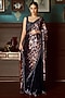 Featuring a midnight blue pre-stitched saree in velvet base with print. It is paired with an embroidered blouse. Accentuate it with statement jewellery and heels for a wedding or festive occasion.