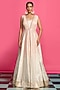 Featuring a peach maxi dress in cotton silk base. It is paired with an ombre-dyed cotton chanderi jacket. Accentuate it with kundan earrings, block heels and a potli bag for a wedding, sangeet or engagement ceremony.