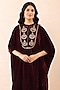 Featuring a wine kaftan in velvet base with gold dori, sequins and pearl work. It is paired with pants. Accentuate it with antique gold statement earrings and embroidered juttis for a refined ensemble, ideal for festive celebrations, intimate wedding functions or elegant evening gatherings.