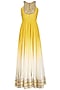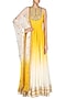 This set features a yellow ombre shaded flared kalidaar anarkali in silk base with floral gota patti embroidery on the front yoke and striped border around the hem. It comes along with an off white embroidered dupatta.
