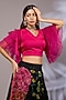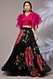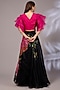 Featuring a black lehenga in organza base with hand-paint, hand embroidery and an attached can-can. It is paired with a magenta ruffled top. Style it with polki earrings and block heels, perfect for weddings or sangeet ceremonies.