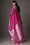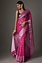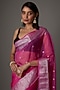 Featuring a hot pink saree in organza base with zari weave detailing. It is paired with an unstitched blouse. This timeless piece is ideal for various occasions and easy to style with different accessories.