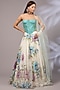 Featuring an off-white lehenga in organza base with hand paint, hand embroidery and an attached can-can. It is paired with a turquoise hand embroidered corset blouse and a net dupatta. Style it with polki earrings and block heels, perfect for weddings or sangeet ceremonies.