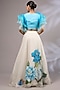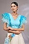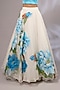 Featuring an off-white lehenga in organza and satin base with hand-paint, hand embroidery and an attached can-can. It is paired with a blue satin top. Style it with polki earrings and block heels, perfect for weddings or sangeet ceremonies.