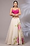 Featuring an off-white lehenga in organza base with hand embroidery, hand paint and an attached can-can. It is paired with a hot pink silk and raw silk corset blouse. Style it with polki earrings and block heels, perfect for weddings or sangeet ceremonies.