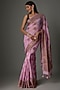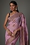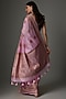 Featuring a pink banarasi saree in linen silk base with copper zari weave detailing. It is paired with an unstitched blouse. This timeless piece is ideal for various occasions and easy to style with different accessories.