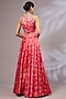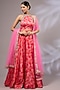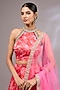 Featuring a pink lehenga in satin silk base with print and an attached can-can. It is paired with a blouse and a net dupatta. Style it with polki earrings and block heels, perfect for weddings or sangeet ceremonies.