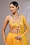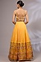 Featuring a turmeric yellow lehenga in organza base with hand embroidery, hand paint and an attached can-can. It is paired with a blouse and a net dupatta. Style it with polki earrings and block heels, perfect for weddings or haldi ceremonies.