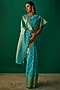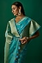 Featuring a turquoise saree in organza banarasi base. It is paired with an unstitched blouse piece. Style it with statement jewellery and heels for a festive occasion or a wedding.