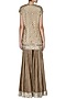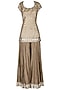 Featuring a beige short kurta in chanderi base, embroidered with sequins and pearls. It is paired with a crushed cotton sharara pants which comes in brown colour with gotta border at the hem. This piece comes along with a mint green net dupatta.