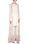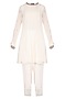 Featuring an off white cape in net base with tube work, pearls and sequins embroidery. It is paired with matching short anarkali kurta and trouser pants in georgette base.