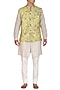 Featuring a lemon yellow bundi jacket in silk chanderi base with grey thread jaal embroidery.