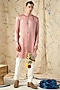 Featuring a pink kurta in cotton silk base with print. It is paired with contrasting off white pajama pants and a bundi jacket.