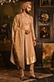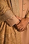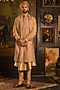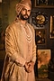 Featuring a deep copper sherwani in silk base with thread, pearl and zardosi hand embellishment. It is paired with an anarkali kurta having banarasi zari weave detailing, churidar pants and an embroidered dupatta. Accentuate it with handcrafted juttis and layered pearls for a refined, royal finish, ideal for wedding ceremonies or grand festive celebrations.