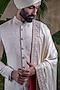 Featuring an ivory sherwani in silk jacquard base. It is paired with churidar pants, a kurta, and a dori embroidered dupatta. Perfect for wedding ceremonies.