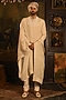 Featuring a light beige sherwani in silk base with dori, zardosi and swarovski hand embellishment. It is paired with a kurta, churidar pants and an embroidered dupatta. Accentuate it with handcrafted juttis and layered pearls for a refined, royal finish, ideal for wedding ceremonies or grand festive celebrations.