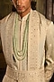 Featuring a mist green sherwani in silk base with dori, pearls and zardosi embroidery. It is paired with an anarkali kurta, churidar pants, a dupatta and a belt. Accentuate it with handcrafted juttis and layered pearls for a refined, royal finish, ideal for wedding ceremonies or grand festive celebrations.