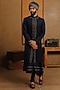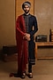 Featuring a navy blue sherwani in silk base with embroidery. It is paired with a matching kurta, churidar pants, and a red organza dupatta. Perfect for wedding ceremonies.