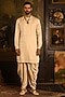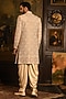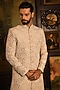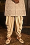 Featuring a rose gold sherwani in silk base with dori thread embroidery and zari weave detailing. It is paired with a kurta and dhoti salwar pants. Accentuate it with handcrafted juttis and layered pearls for a refined, royal finish, ideal for wedding ceremonies or grand festive celebrations.
