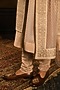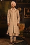 Featuring a rose gold sherwani in silk base with dori, thread, glass pearls and zardosi embroidery. It is paired with an anarkali kurta, churidar pants, a banarasi embroidered dupatta and a belt. Accentuate it with handcrafted juttis and layered pearls for a refined, royal finish, ideal for wedding ceremonies or grand festive celebrations.