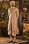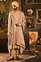 Featuring a rose gold sherwani in silk base with thread, pitta tilla and zardosi hand embroidery. It is paired with a banarasi silk anarkali kurta, churidar pants and an embroidered dupatta. Accentuate it with handcrafted juttis and layered pearls for a refined, royal finish, ideal for wedding ceremonies or grand festive celebrations.