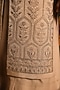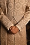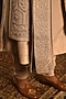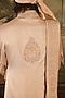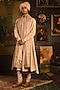 Featuring a rose gold sherwani in silk base with floral motifs, thread, pitta tilla and zardosi embroidery, including an attached belt. It is paired with an anarkali kurta having banarasi zari detailing, churidar pants and a dupatta. Accentuate it with handcrafted juttis and layered pearls for a refined, royal finish, ideal for wedding ceremonies or grand festive celebrations.