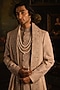 Featuring a rose taupe sherwani in silk base with thread work and motifs embroidery. It is paired with a kurta, churidar pants and a dupatta. Accentuate it with handcrafted juttis and layered pearls for a refined, royal finish, ideal for wedding ceremonies or grand festive celebrations.