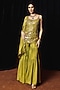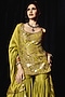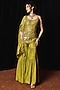 Punit Balana presents a mesmerizing dry heena green strappy kurta in silk base with chandi tilla work. It is paired with gharara pants and an organza silk dupatta having chand tilla work. Style it with mirror-work mojaris, silver chandbalis, and a braided ponytail for a playful yet polished vibe. Ideal for daytime mehendi or festive brunches.