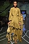 Featuring a henna green shirt in satin silk base with bandhani print and mirror work at the cuff. It is paired with a matching asymmetric tiered skirt.