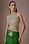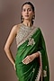 Featuring a kaccha aam green saree in organza silk base with marodi work. It is paired with a chanderi silk embroidered stitche blouse. Accentuate it with polki jewellery and block heels for festive events, weddings or mehendi ceremony.