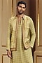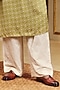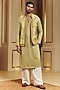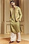 Featuring a heena green bundi jacket in satin silk base with patch work, resham and coin embroidery. It is paired with a bandhani kurta and off-white loose pants. Style it with pair of mojaris and a mala for a traditional look, Perfect attire for mehendi or wedding ceremony.