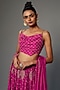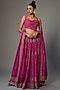 Featuring a pink lehenga in silk base. It is paired with a matching blouse and a dupatta.