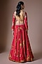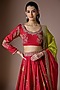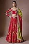 Featuring a red lehenga in pure silk base with marodi hand embroidery. It is paired with a blouse and green dupatta. Style this lehenga set with kundan polki jewellery, a polti bag and block heels for weddings celebrations or festive occasions.