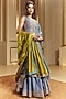 Punit Balana presents a mesmerizing saleti grey lehenga in tissue silk base with marodi and applique embroidery. It is paired with an embroidered waistcoat and a green organza silk dupatta having dabka and salma sitara work. Style this designer lehenga set with wedges, gold jhumkas and a sleek bun for a chic ethnic look. Ideal for festive gatherings, family functions, or sangeet ceremonies.
