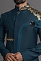 Featuring a teal blue indowestern in suiting base with cutdana and crystal hand embroidery. It is paired with contrasting trousers.