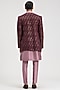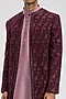 Featuring a wine indowestern in silk base with sequins and resham hand and machine embroidery. It is paired with a contrasting kurta and tapered trousers.