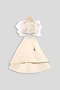 Featuring a light beige blouse in lace base with machine embroidery. It is paired with a matching layered skirt in taffeta base.