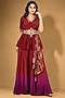 Featuring a maroon peplum kurta in crepe base. It is paired with matching sharara pants, a lurex printed dupatta, and an embroidered belt.