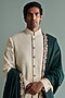 Featuring a cream sherwani in silk base with pintucks and dhaga work. It is paired with matching churidar pants in cotton silk base, a kurta, and a moonga silk dark bottle green stole having embroidery.
