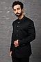 Featuring a black bandhgala jacket in jacquard base with embroidery. It is paired with matching wool viscose pants.