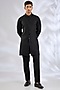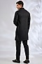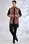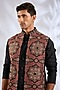 Featuring a black bundi jacket silk base. It is paired with a kurta and pants. Style it with a pair of mojaris and a watch for a festive occasion, wedding, engagement or sangeet ceremony.