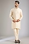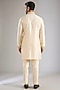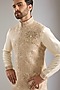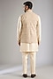 Featuring a blush bundi jacket silk base. It is paired with a kurta and pants. Style it with a pair of mojaris and a watch for a festive occasion, wedding, engagement or sangeet ceremony.