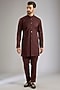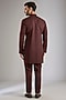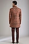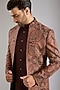 Featuring a brown bundi jacket silk base. It is paired with a kurta and pants. Style it with a pair of mojaris for a wedding, engagement or sangeet ceremony.