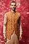 Featuring a mustard bundi jacket in chanderi silk base with embroidery. It is paired with a contrasting gold satin kurta and dhoti pants.