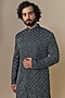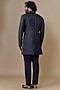Featuring a navy blue indowestern in cotton silk base with thread hand embroidery. It is paired with viscose suiting knit trousers. Perfect attire for festive occasions, exuding charm and elegance.