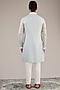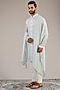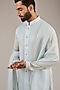 Featuring a powder blue kurta in georgette base with a stripe print. It is paired with ivory viscose wool trousers and a pearl embroidered stole. Ideal attire for festive occasions or sangeet ceremonies, exuding elegance and charm.