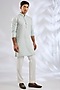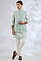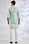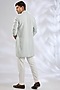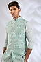 Featuring a powder blue bundi jacket silk base. It is paired with a kurta and pants. Accentuate it with pair of kolhapuris and a sleek watch for a refined look, ideal for festive gatherings, wedding or sangeet ceremony.