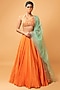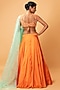 Featuring a bright orange lehenga in modal and organza base with cutdana, moti, stones, anchor thread, and zari hand embroidery. It is paired with a matching blouse and a pastel turquoise dupatta.